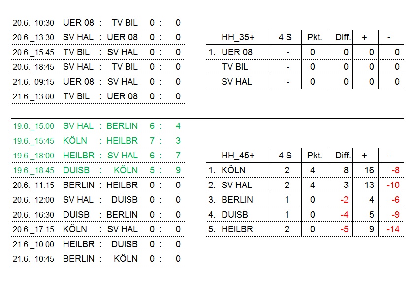 Im Auftaktspiel zu den 20. Deutschen Meisterschaften glänzte das Team der Ü45 der Halle-Masters gegen den Mitfavoriten aus Berlin-Charlottenburg mit einem verdienten 6:4-Sieg. In einer phasenweise hochklassigen Partie lagen die Hallenser bis auf eine Führung der Charlottenburger über die gesamte Spielzeit vorn und konnten sowohl in der Defensive als auch im Angriff überzeugen.
