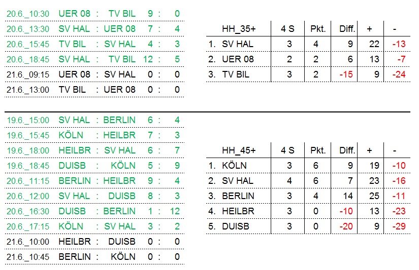 Nach dem gestrigen Auftakt in der Ü45 startete heute auch das Ü35-Team der Hallenser in das Turnier. Zum Auftakt stand mit dem SV Bayer Uerdingen 08 der Favorit in der Altersklasse Ü35 auf dem Spielplan. Aus einer sicher sehenden Abwehr heraus erspielte sich das Ü35-Masters-Team schöne Angriffskombinationen, die mit zahlreichen sehenswerten Torerfolgen abgeschlossen wurden. Mit 7:4 für die Halle-Masters '09 Ü35 war die Überraschung in der AK 35+ perfekt. Im 2. Spiel des Tages standen uns die Hamburger vom TV Gut Heil Billstedt gegenüber. Ohne den Unparteiischen zu Nahe treten zu wollen, war der Heimvorteil der Hamburger nicht zu übersehen. Somit ging die 1. Partie gegen den TV Gut Heil Billstedt mit 3:4 verloren. Aber man sollte sich wenige Stunden später im Rückspiel gegenüberstehen. Jetzt zeigten die Hallenser, dass sie spielerisch das weitaus bessere Team sind und gewannen deutlich mit 12:5. Nunmehr kommt es morgen zum Endspiel um die Meisterschaft gegen Bayer Uerdingen.
